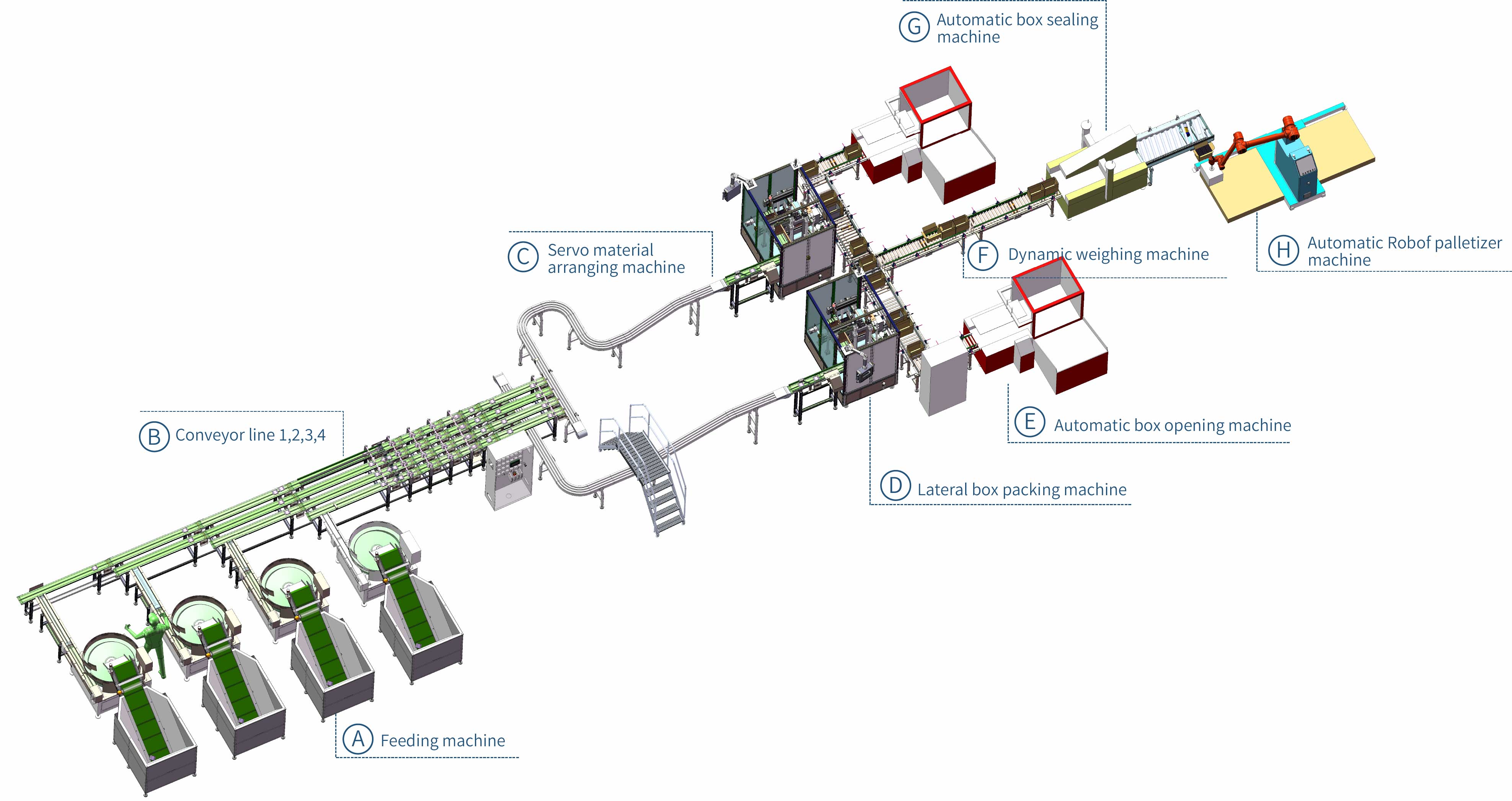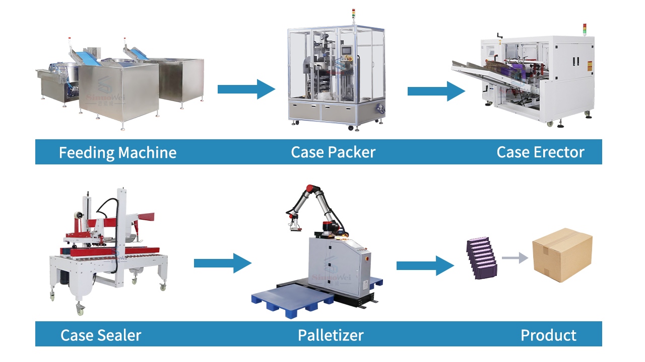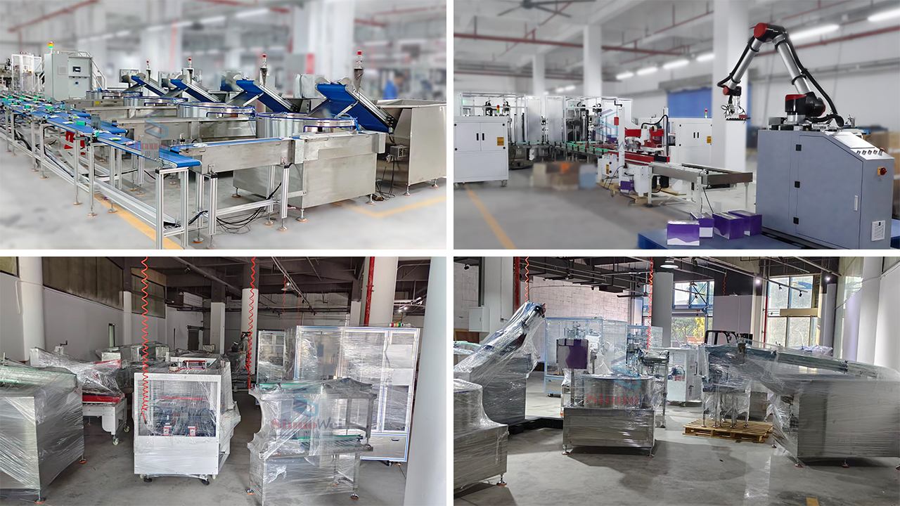 Die automatische Lebensmittelverpackungslinie ermöglicht die vollständige Prozessautomatisierung vom Abfüllen der Produkte in Beutel bis hin zum Verpacken und Palettieren. Die Bediener müssen lediglich die Lebensmittel in die Zuführschale füllen, und die Anlage übernimmt automatisch Aufgaben wie Materialausrichtung, Verpacken, Versiegeln und Palettieren. Dies steigert die Produktionseffizienz deutlich, senkt die Personalkosten und gewährleistet einen schnellen, stabilen und standardisierten Verpackungsprozess.